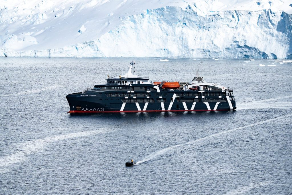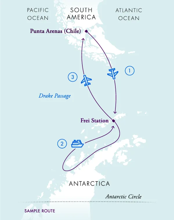 The journey begins in Punta Arenas, Chile, the gateway to Chilean Patagonia. From there, a specially equipped two-hour flight takes travellers directly to Antarctica, where they board their expedition vessel waiting near the continent.